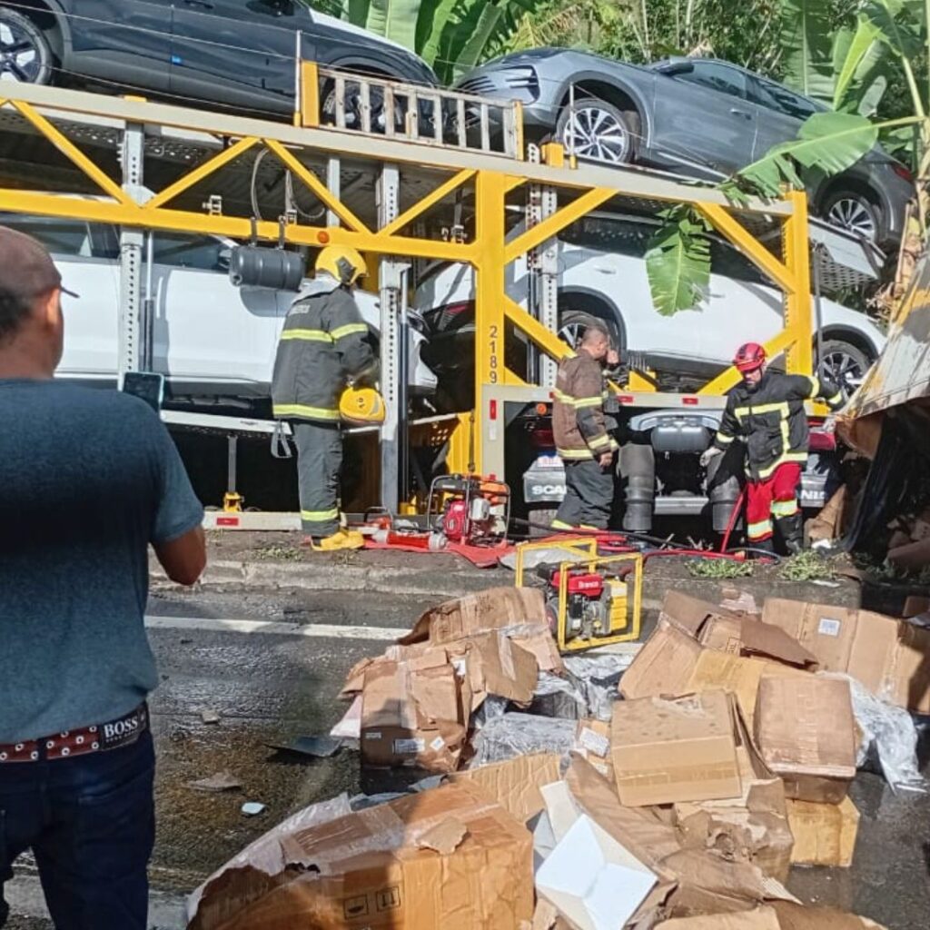 Acidente entre caminhão-cegonha, ônibus de turismo e veículos de carga interdita a BR-101 em Mimoso do Sul, no ES