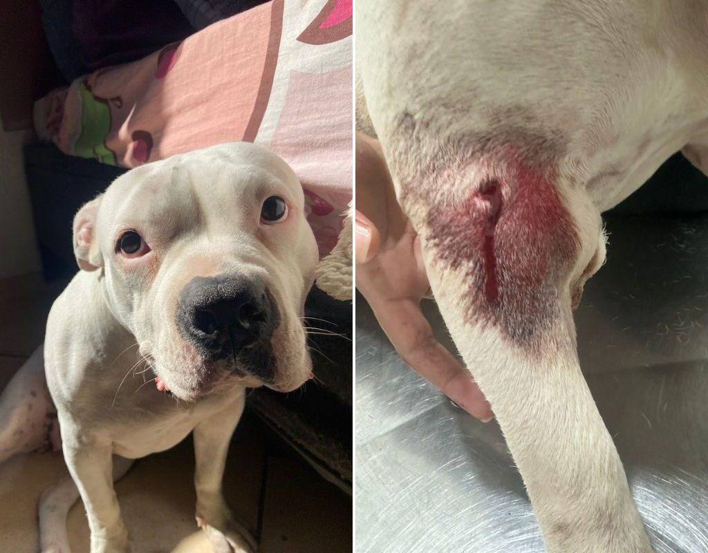 Cadela da raça American Bully leva tiro de guarda em Cubatão.