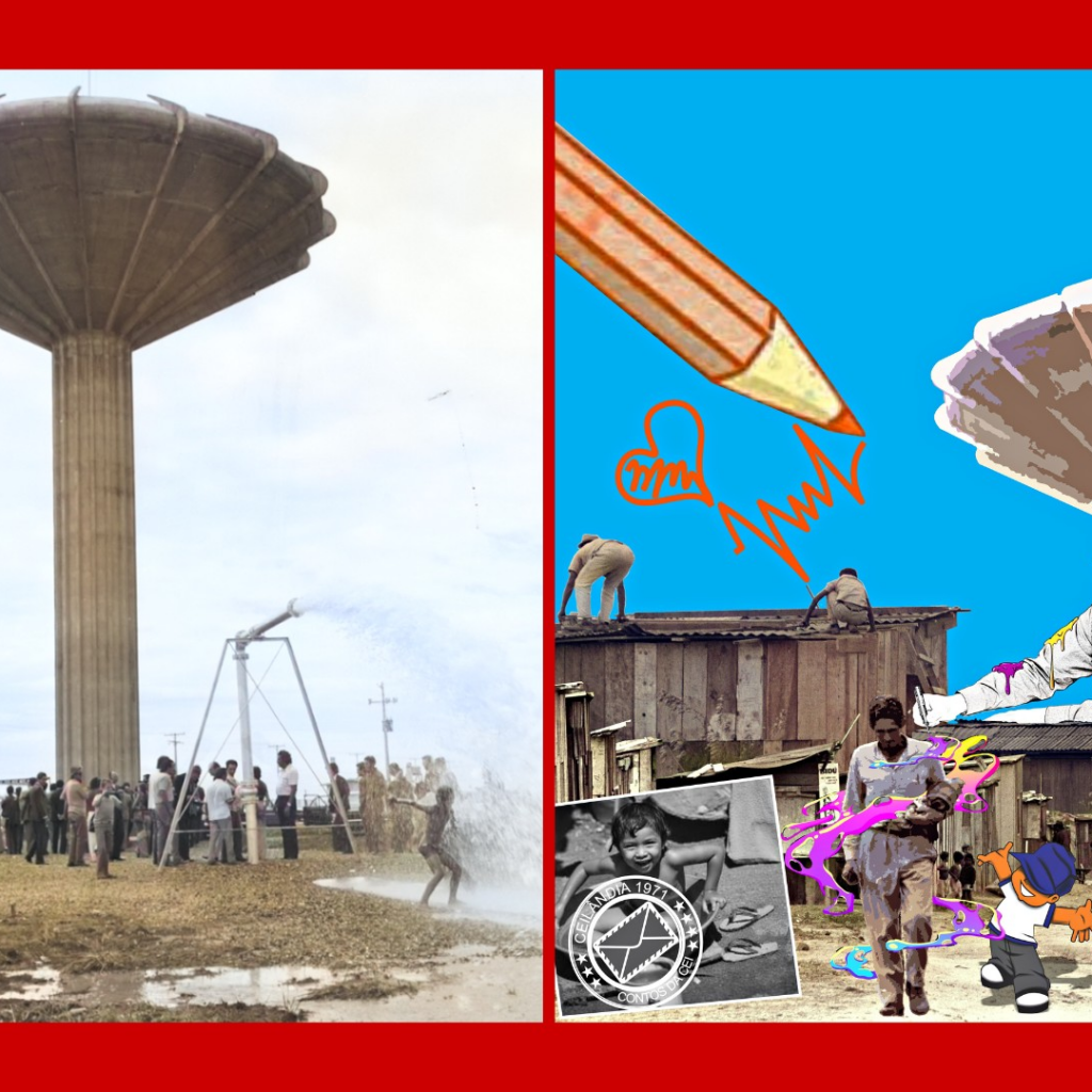 À esquerda foto original da caixa d’água da Ceilândia e à direita obra do artista Elom