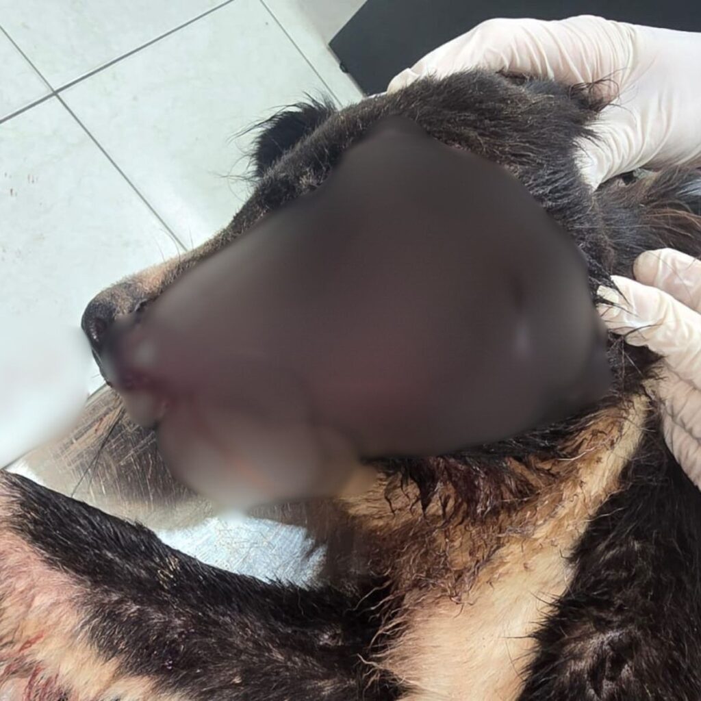 De acordo com o texto, o caso foi amplamente divulgado com relato de que o cachorro foi encontrado com ferimentos graves e tinha exposição de ossos na região do crânio e do focinho.