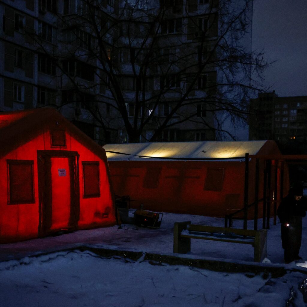 Em Kiev, pessoas se aquecem e carregam seus dispositivos dentro de um abrigo temporário que oferece serviços básicos e aquecimento durante os apagões