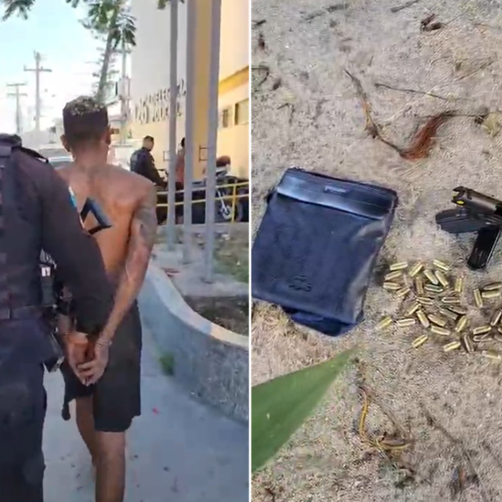 Na ação, foi apreendida uma pistola calibre 45, acompanhada de 38 munições do mesmo calibre, além de dez tabletes de maconha, 44 pinos de cocaína, uma pedra de crack e um aparelho celular.
