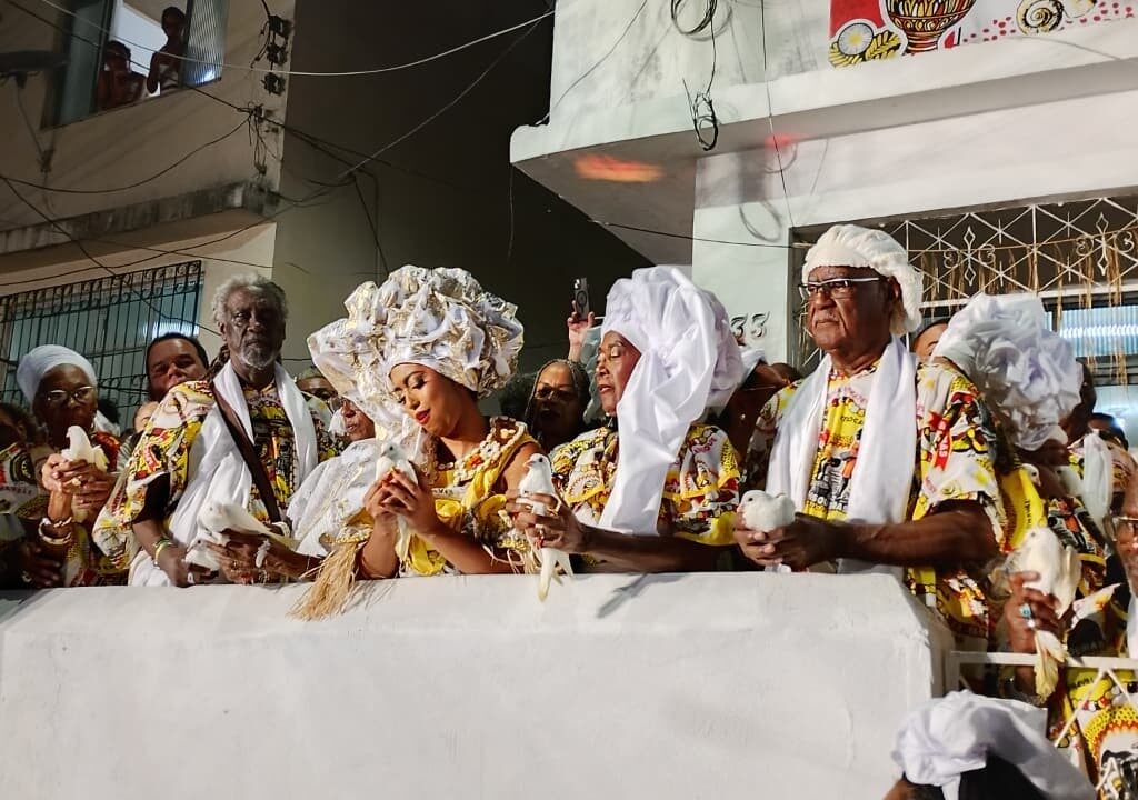 Outra tradição simbólica é a soltura das pombas brancas, dedicadas a Oxalá. O gesto reforça a mensagem de paz e a trajetória do Ilê Aiyê como um movimento de resistência cultural e política desde 1974, quando enfrentou preconceito por ser o primeiro bloco afro do país.