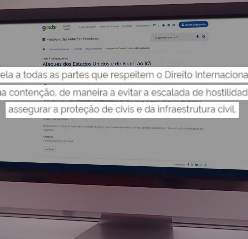 “O governo brasileiro condena e expressa grave preocupação com os ataques realizados por Estados Unidos e Israel contra alvos no Irã”.