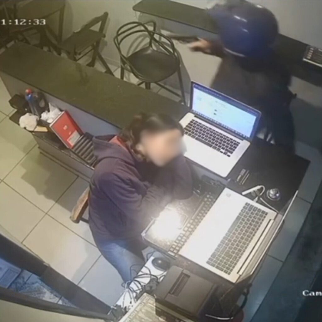 De acordo com as imagens, um homem armado, usando capacete, entrou no local e anunciou o assalto. Durante a ação, a atendente percebe a movimentação do suspeito e tenta esconder parte do dinheiro do caixa na roupa. Ainda assim, o criminoso leva o restante do valor e foge em seguida.