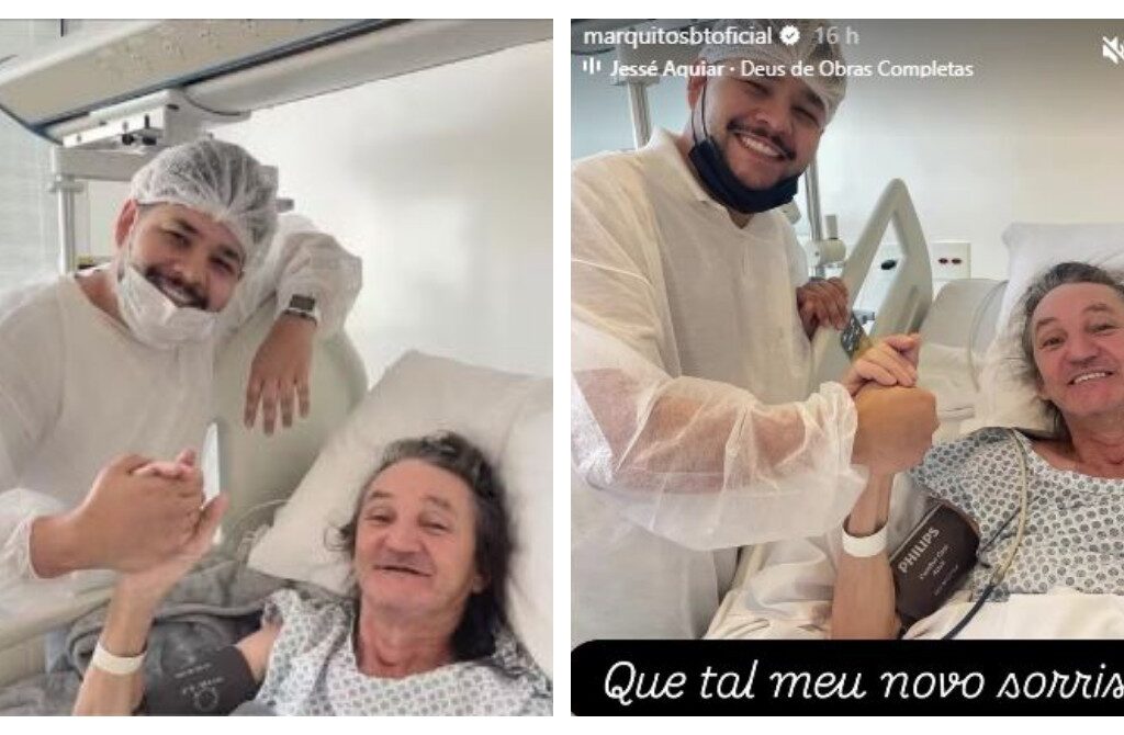 Há cerca de uma semana, Marquito apareceu banguela ao lado de seu dentista no hospital onde está internado após grave acidente de moto. Depois surgiu com prótese dentária, no último dia 26 de abril