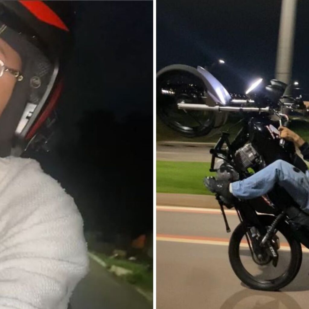 Nas imagens transmitidas em tempo real no próprio perfil nas redes sociais, o suspeito aparece em alta velocidade, usando capacete com microfone enquanto faz manobras perigosas. A namorada de Leandro estava junto com ele, segundo a polícia.