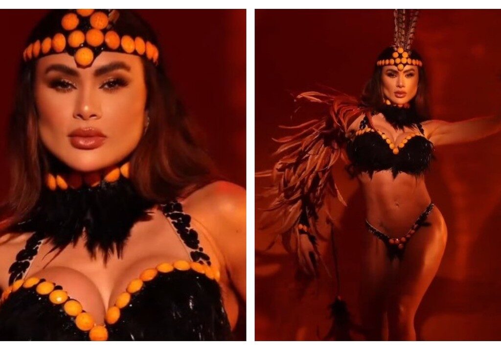 O figurino é composto por um biquíni cravejado de cristais, com efeito “dripping”, que cria a impressão de joia líquida escorrendo pelo corpo. A peça destacou as curvas da apresentadora, com amarrações delicadas que reforçaram a silhueta. O visual foi complementado por um manto azul profundo, volumoso e dramático, que trouxe movimento e contraste ao brilho prateado das pedrarias.