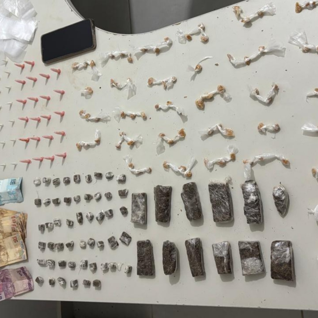Com o suspeito, foram encontradas porções de drogas, dinheiro e um celular. Questionado, ele indicou outros locais onde havia escondido mais entorpecentes. Durante as buscas, os militares localizaram materiais em diferentes pontos, como uma sacola pendurada em uma árvore, um beco ao lado de um imóvel e também dentro de uma panela de pressão, utilizada para ocultar parte das substâncias.