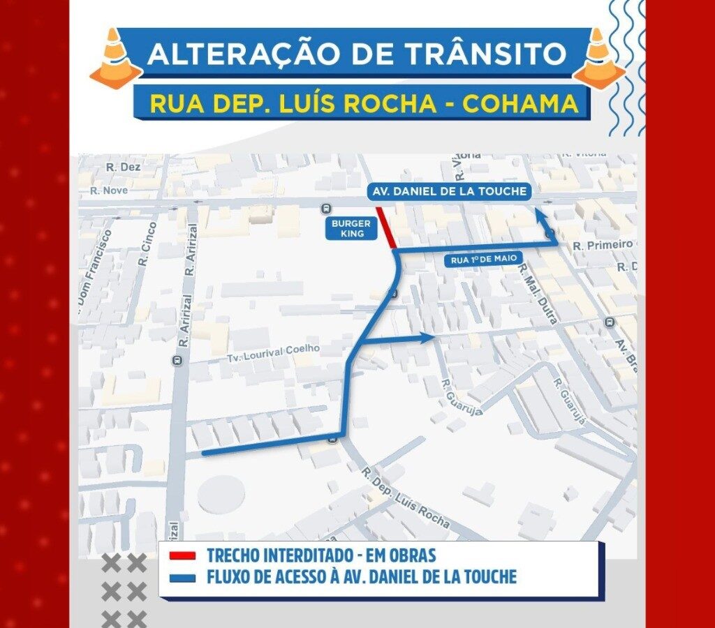 Um trecho da Rua Deputado Luís Rocha, no bairro Cohama, em São Luís, será interditado a partir das 22h desta sexta-feira (10) para obras. A interdição ocorrerá entre a Rua 1º de Maio e a Avenida Daniel de La Touche, e seguirá até domingo (12).
