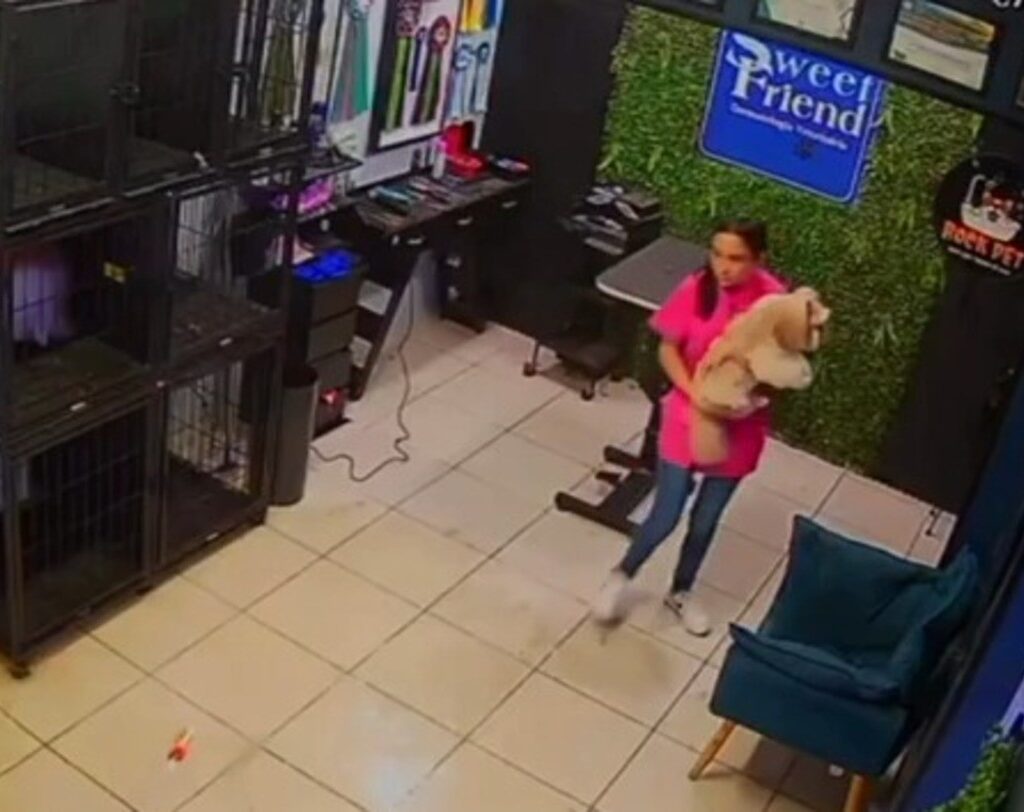Nas imagens, é possível perceber o momento em que a água começa a invadir o local e um dos animais, que passava pelo processo de banho e tosa, é levado às pressas por uma funcionária para fora da sala alagada.