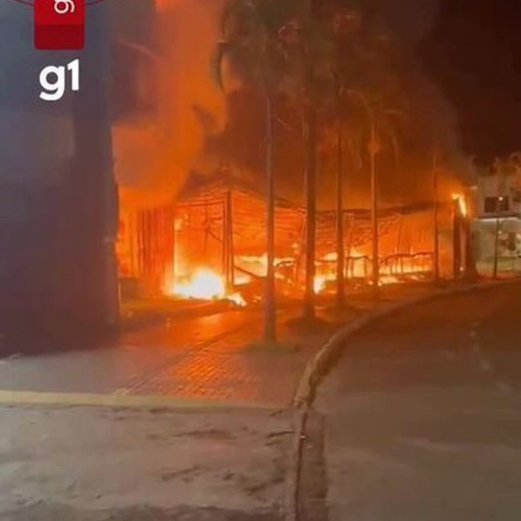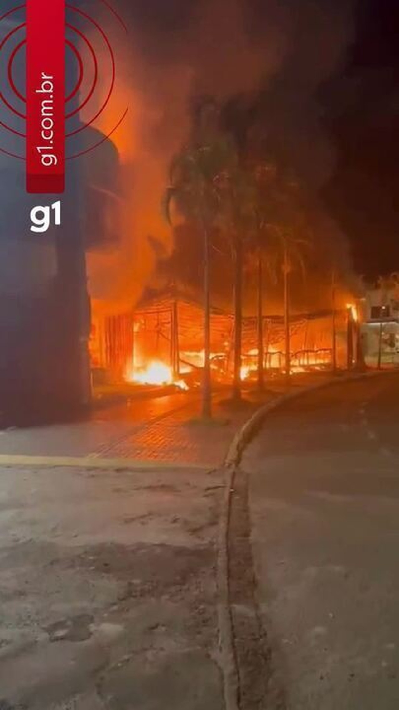Vídeos registrados por câmeras de segurança e por pessoas que passavam pelo local mostram a estrutura sendo consumida pelo fogo (vídeo acima).