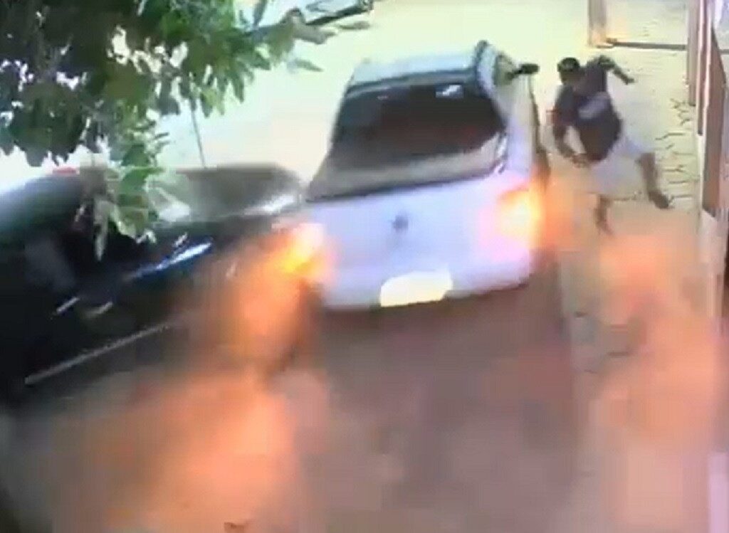 Nas imagens, é possível ver o momento em que o motorista perde a direção, atravessa a rua, atinge uma caminhonete e, por um triz, não acerta o homem que estava na calçada.