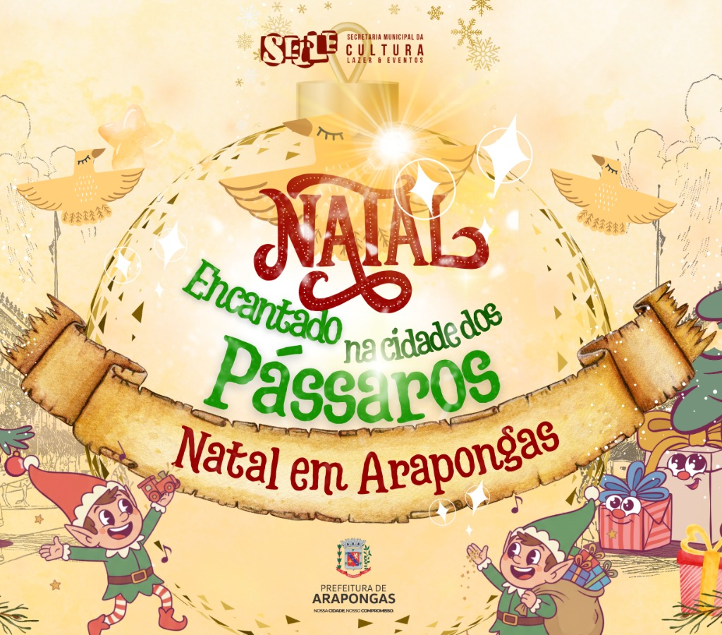 A Prefeitura de Arapongas, por meio da Secretaria Municipal de Cultura, Lazer e Eventos (SECLE), divulgou, na manhã desta segunda-feira (17), a programação completa do Natal Encantado da Cidade dos Pássaros 2025, que vai acontecer no período de 28 de novembro a 21 de dezembro. Haverá diversas atividades por toda a cidade, que vão seguir o conceito “A Cidade dos Pássaros celebra o Natal com arte, fé e afeto”.