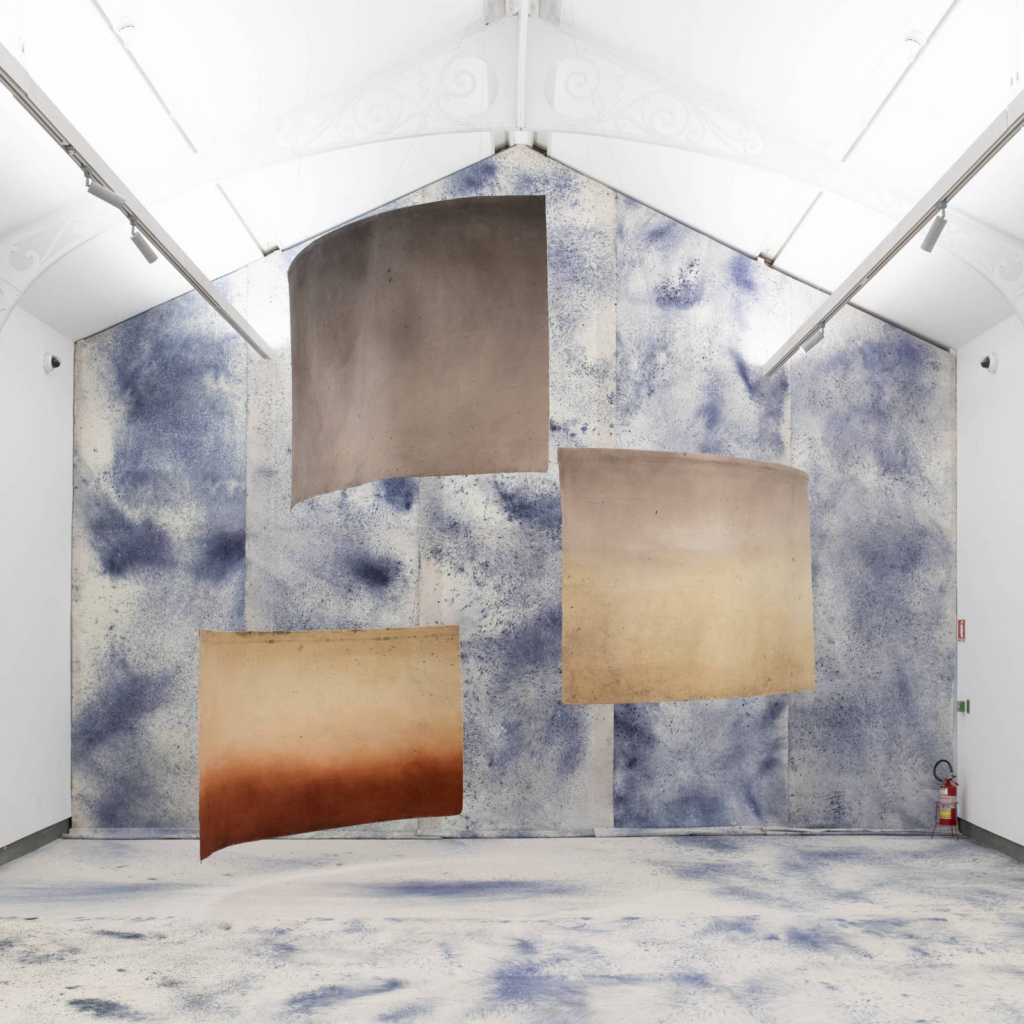 Juliana dos Santos atravessa um grande tapete tingido de azul. Para andar sobre ele, é necessário tirar os sapatos. Obtidas a partir da flor Clitoria Ternatea, manchas coloridas inscrevem linhas, círculos e uma série de formas abstratas. Não há padrões no modo como elas se dispersam pela superfície. Distante de um domínio sobre esses pigmentos, a artista se coloca como uma eterna aprendiz da espécie vegetal.