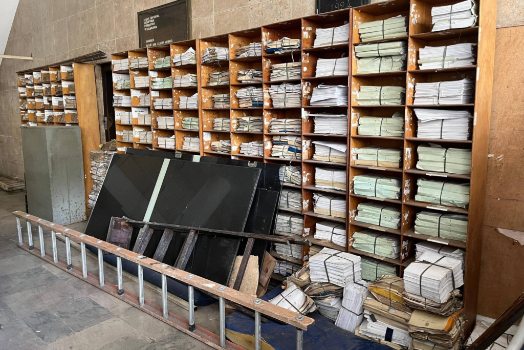 Foram encontrados documentos armazenados de forma precária, acúmulo de sujeira, presença de fezes de pombos sobre armários e papéis, janelas quebradas, deterioração de microfilmes e material inflamável.