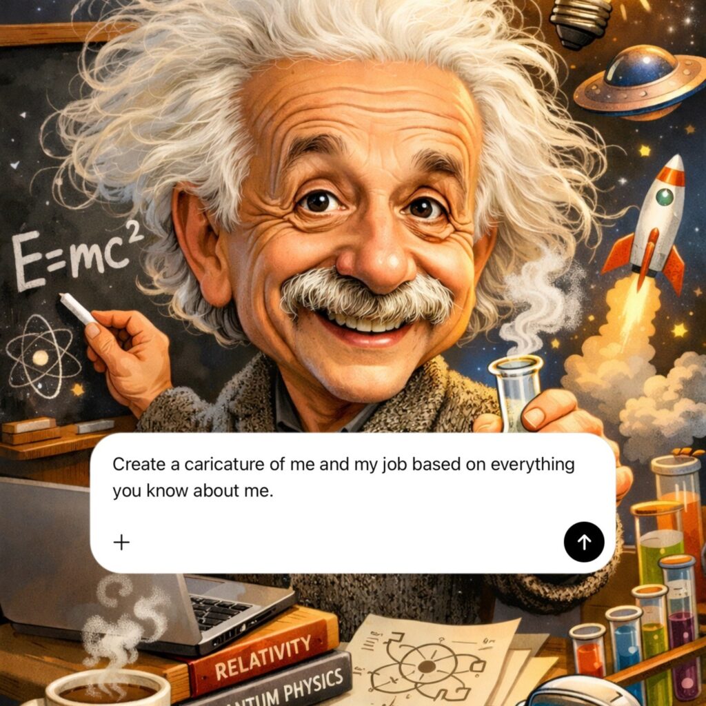 Este é um comando que foi usado por muitos usuários: “Crie uma caricatura minha no meu ambiente de trabalho, levando em conta tudo o que você sabe sobre mim”.