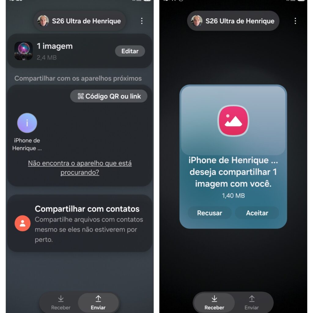 Envio e recebimento de arquivos de iPhone no Galaxy S26 Ultra por AirDrop