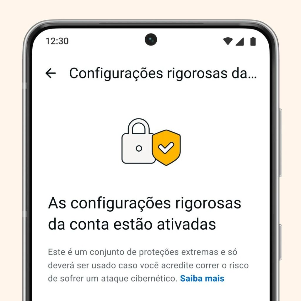 Para ativar a proteção adicional, é preciso acessar “Configurações”, selecionar “Privacidade”, clicar em “Configurações avançadas” e habilitar a opção “Configurações rigorosas da conta”.