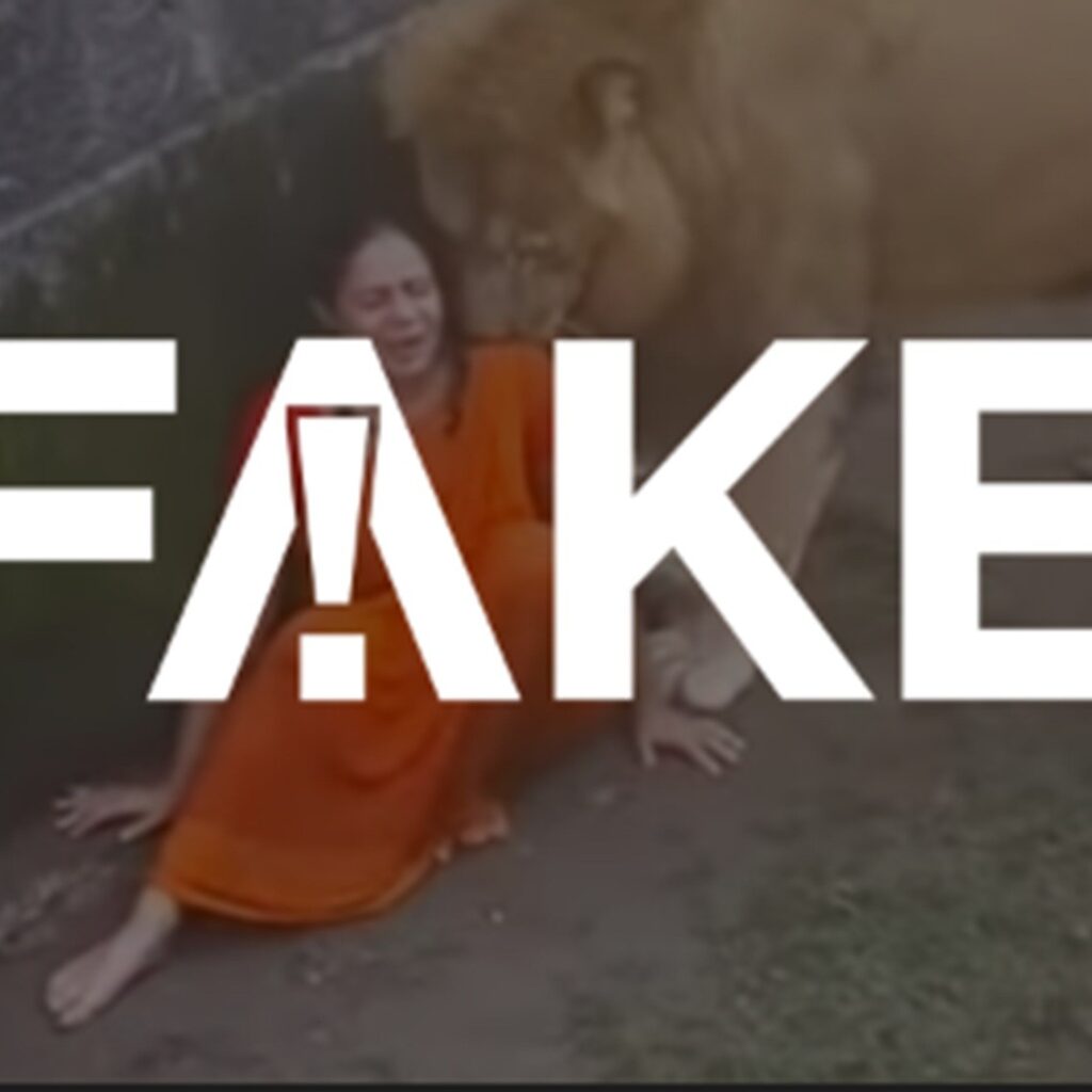 É #FAKE que vídeo mostre leão cheirando mulher que teria caído em jaula na Índia; cena foi criada com IA