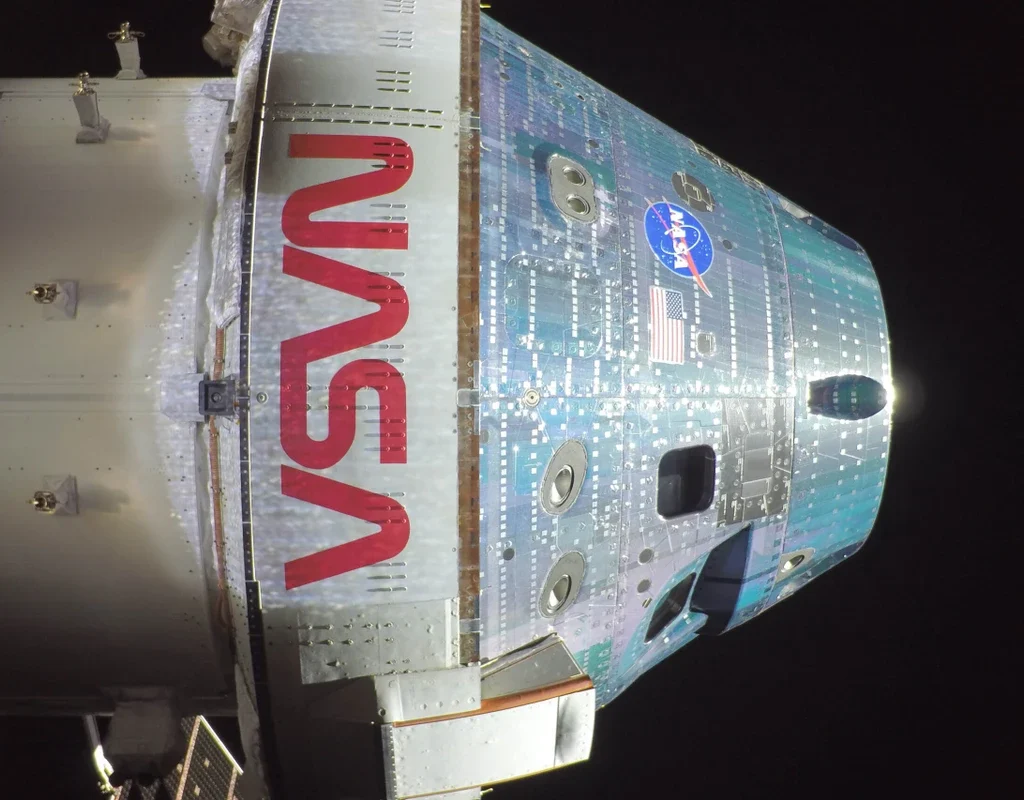 Visão aproximada da espaçonave Orion durante o sobrevoo lunar
