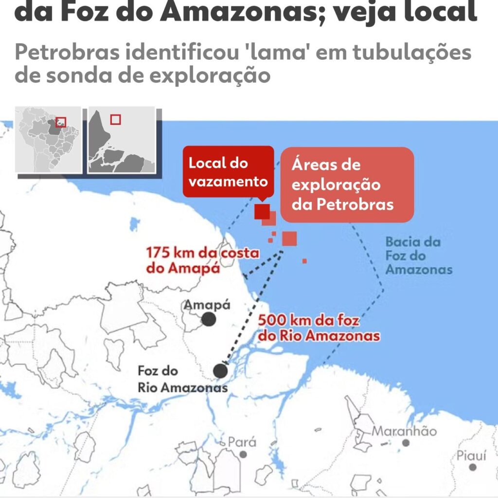 Infográfico mostra local de vazamento que fez Petrobras interromper perfuração na Foz do Amazonas.