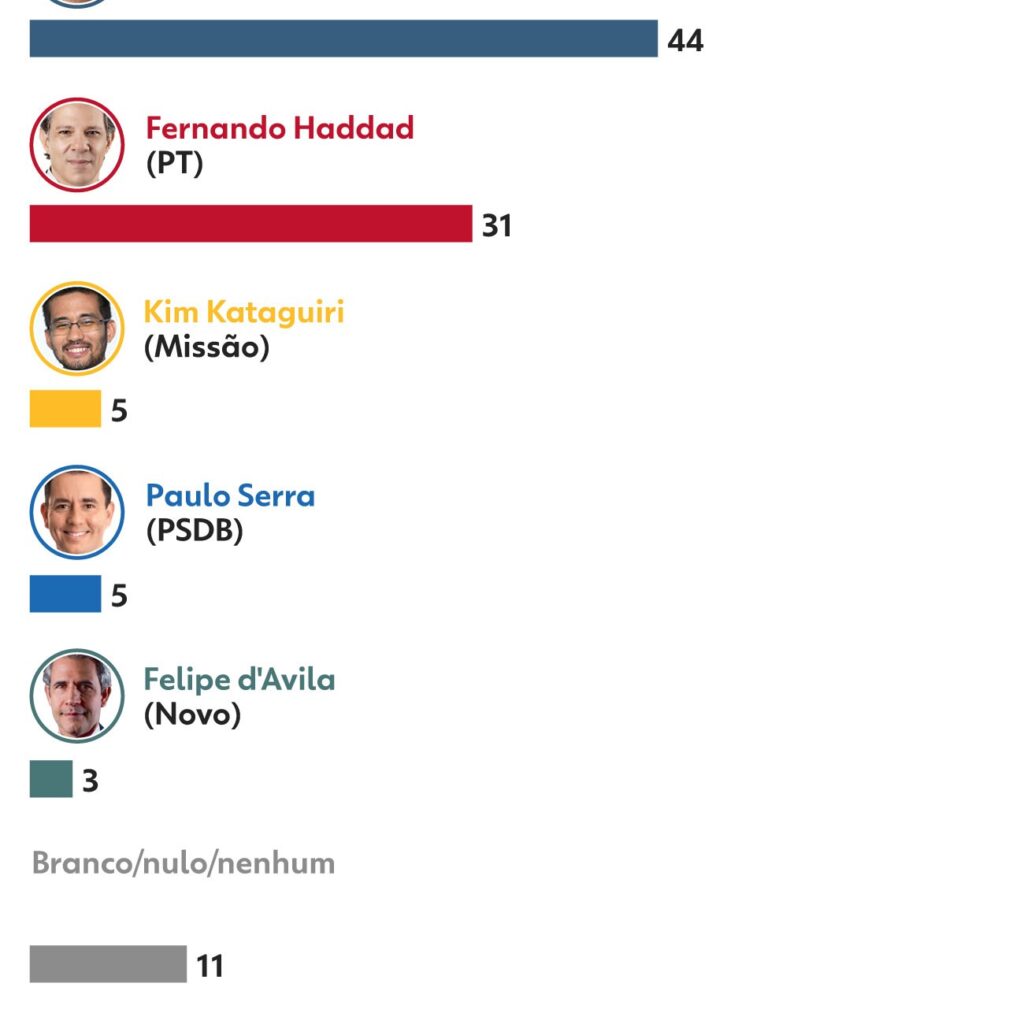 Em um cenário de primeiro turno contra o ministro da Fazenda, Fernando Haddad, Tarcísio aparece na frente com 44% das intenções de voto.