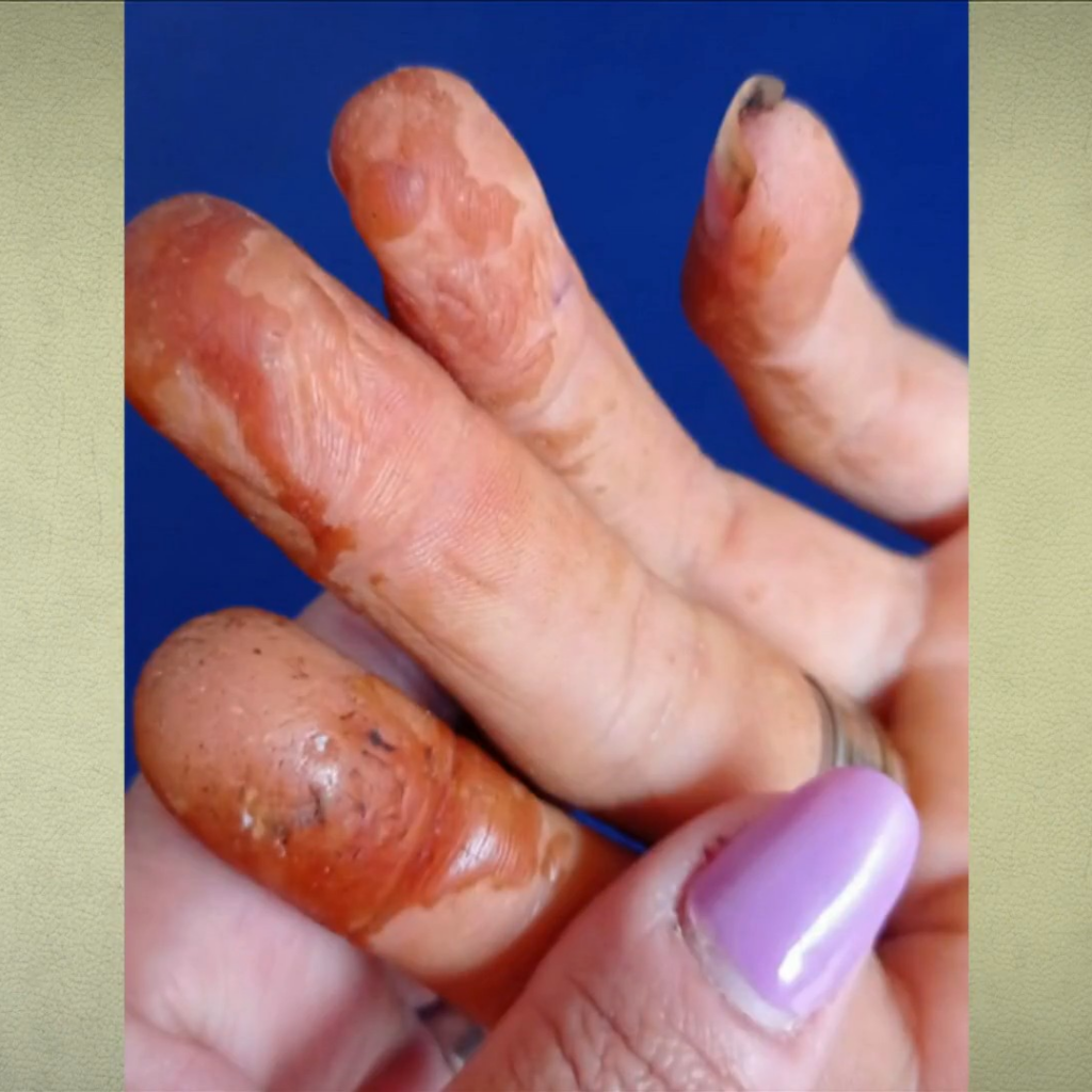 Isso é causado pelo Líquido da Casca da Castanha de Caju (LCC), que é liberado na torra. Ele pode queimar, irritar a pele e até mesmo apagar as impressões digitais.