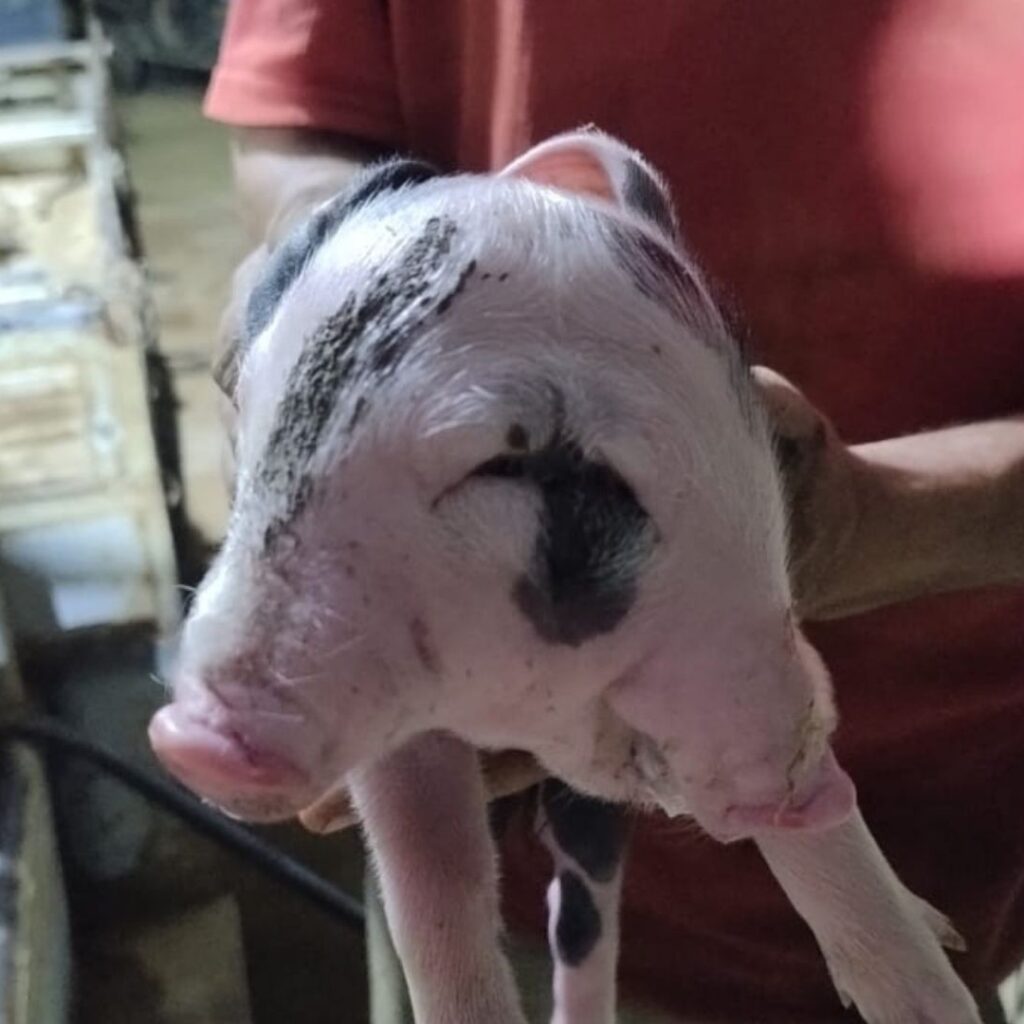 Um porquinho nasceu com uma malformação rara na zona rural de Alfredo Chaves, na Região Serrana do Espírito Santo. O animal tem um só corpo, quatro patas e duplicação da face, condição conhecida como diprosopia.